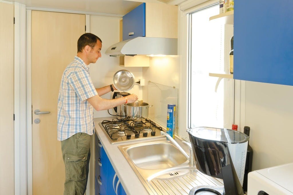 Mobilne hiške ponujajo osnovno kuhinjsko opremo (npr. velik lonec, dva manjša, ponev, skodelice, kozarci, krožniki, jedilni pribor). Samo bolje opremljene hiške imajo tudi mikrovalovno pečico in aparat za kavo, zelo redke pa pomivalni stroj. Če boste na dopustu veliko kuhali, potem s seboj vzemite še kakšno dodatno posodo oziroma tiste pripomočke, ki so za vas »nujni«. In za kavo nujno vzemite džezvo in pa vašo veliko skodelico.