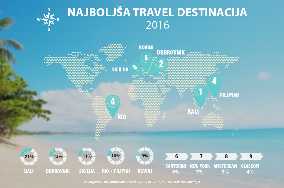 Anketo sta skupaj z Vandraj.si izvedla Megabon.eu in Delo.si v časovnem obdobju med 9. februarjem  in 14. marcem letos, podatki pa so zbrani s spletno raziskavo. Kot inštrument zbiranja podatkov je uporabljen enostaven vprašalnik. Vsebina raziskave je vključevala vprašanje na temo »Najboljša travel destinacija leta 2016 je?« Svoja razmišljanja je z nami delilo 5. 911 anketirancev. V anketi je ponujenih 10 popularnih destinacij po vzoru rastočih svetovnih trendov. Ta so že leta in leta na seznamu najbolj obiskanih turističnih izbir, kot tudi manj popularne, ki presenečajo s hitro rastjo števila obiskovalcev.